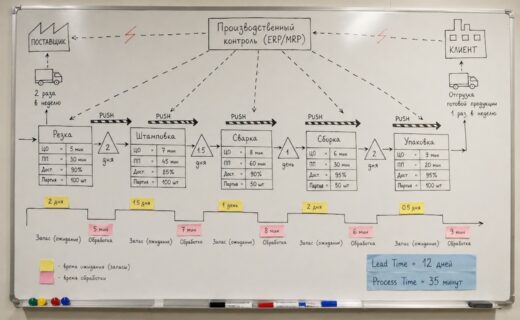 Карта потока создания ценности (VSM, Value Stream Map) — позволяет увидеть весь поток производства от сырья до готовой продукции: где создается ценность, где материал просто ждет, каково время цикла каждого этапа, каковы запасы между этапами. VSM — один из самых мощных инструментов для системного взгляда на потери.