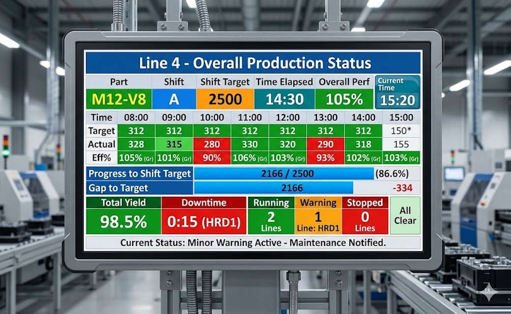 Мастер, бригадир, руководитель смены и сами операторы могут сразу увидеть, где линия работает нормально, где возникли отклонения, есть ли простои, как идёт выпуск относительно плана и какие участки требуют внимания. Поэтому Andon — это важная часть системы визуального управления: он делает состояние процесса видимым и понятным для всех.