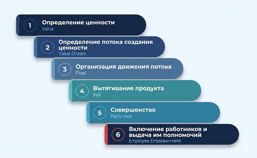 Для наглядного визуального отображения текущего состояния производственных процессов строится карта потока создания ценности (VSM). После обсуждения проблем и вариантов их решения, наступает этап внедрения изменений. Чтобы выстроить поток создания ценности, руководствуйтесь следующими принципами: