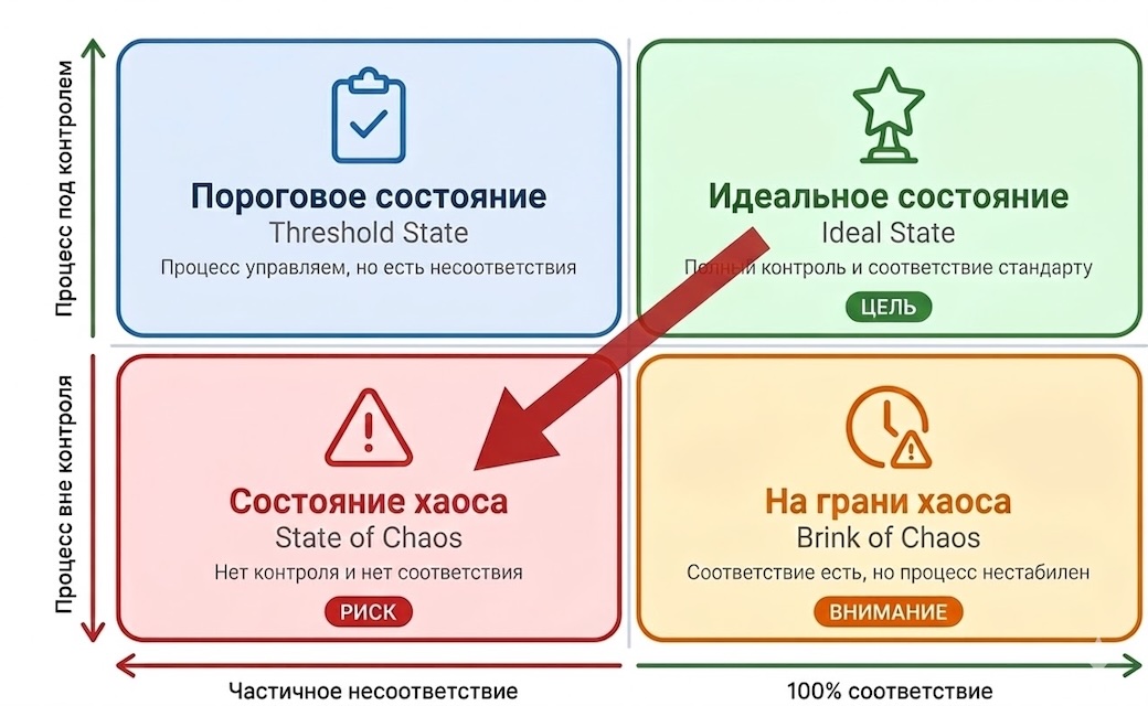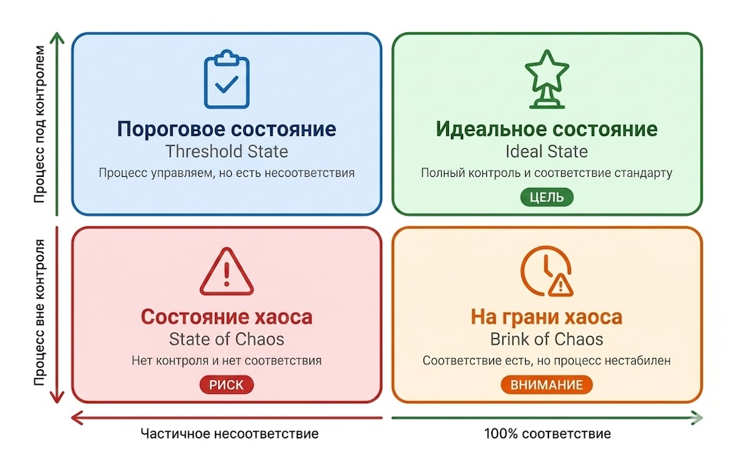Когда процесс работает в идеальном состоянии, этот процесс находится под статистическим контролем и обеспечивает 100% соответствие. Этот процесс доказал стабильность и целевую эффективность с течением времени. Этот процесс предсказуем, и его результат соответствует ожиданиям клиентов. Процесс, который находится в пороговом состоянии, характеризуется тем, что находится в состоянии статистического контроля, но все еще вызывает случайное несоответствие. Этот тип процесса будет производить постоянный уровень несоответствий и демонстрирует низкие возможности. Несмотря на предсказуемость, этот процесс не всегда соответствует потребностям клиентов. Состояние грани хаоса отражает процесс, который не находится под статистическим контролем, но также не вызывает дефектов. Другими словами, процесс непредсказуем, но результаты процесса все еще соответствуют требованиям клиента. Отсутствие дефектов приводит к ложному чувству безопасности; однако, как таковой процесс может привести к несоответствиям в любой момент. Это только вопрос времени. Четвертое состояние процесса — это состояние хаоса. Здесь процесс не находится в статистическом контроле и производит непредсказуемые уровни несоответствия.