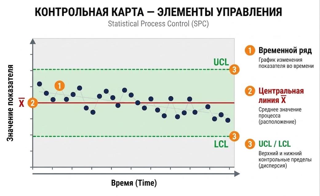 Существует три основных элемента контрольной карты, как показано на рисунке 8.