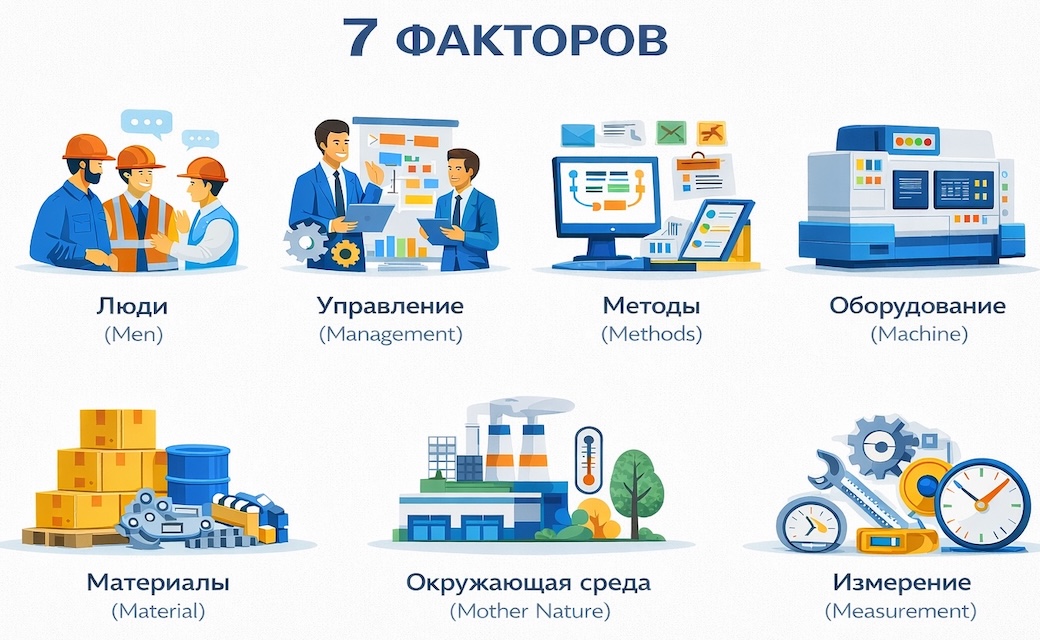 Искать и устранять потери при внедрении Бережливого производства проще, если использовать 7 необходимых и достаточных факторов производственной системы. Эта классификация позаимствована нами у господина К. Исикавы (Ishikawa) и доработана на практике.